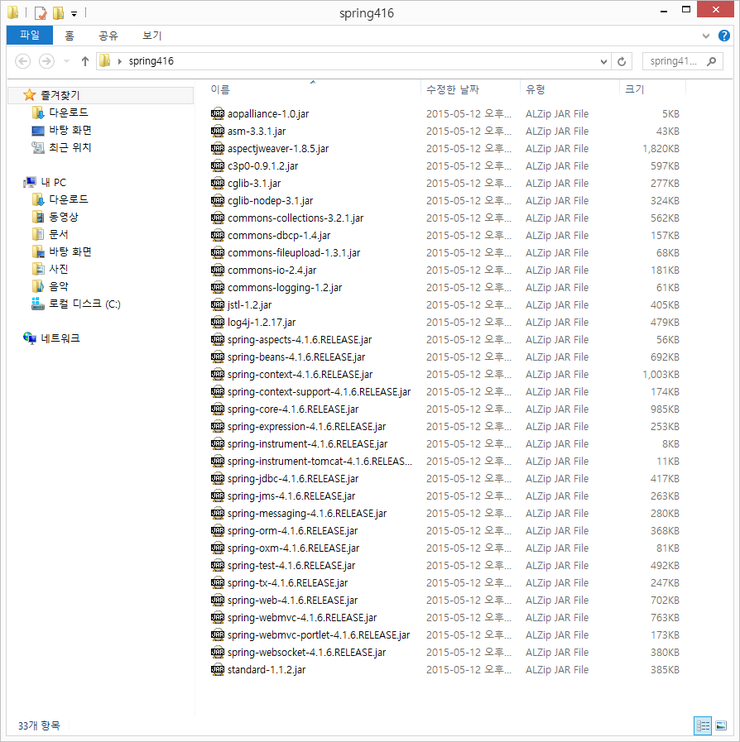 작성일자 2015년 5월 12일 글쓴이 thkmonspring 4.1.6 jar모음 spring 4.1.6 jar모음 스프링 4.1.6 올인원(all in one, allinone,all-in-one) 첨부파일 2개를 다운받아 압축풀면 아래와 같이 jar파일들이 나온다(34개).