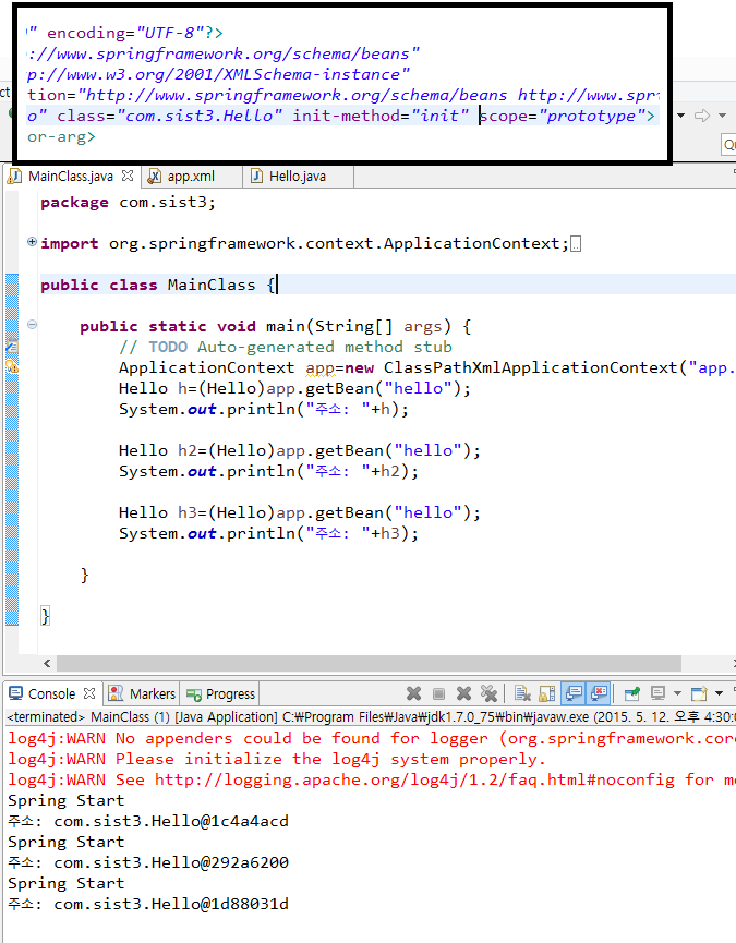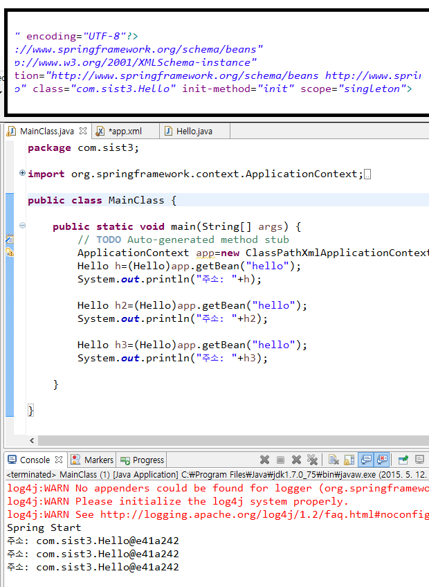<bean id=”hello” class=”com.sist3.Hello” scope=”singleton”>