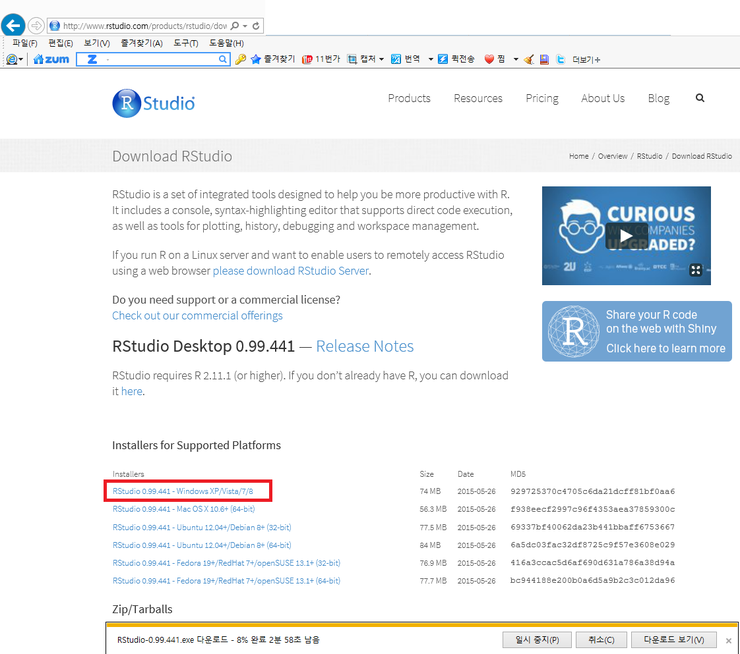 http://www.rstudio.com/products/rstudio/download/ 에서 RStudio 0.99.441 – Windows XP/Vista/7/8 다운로드