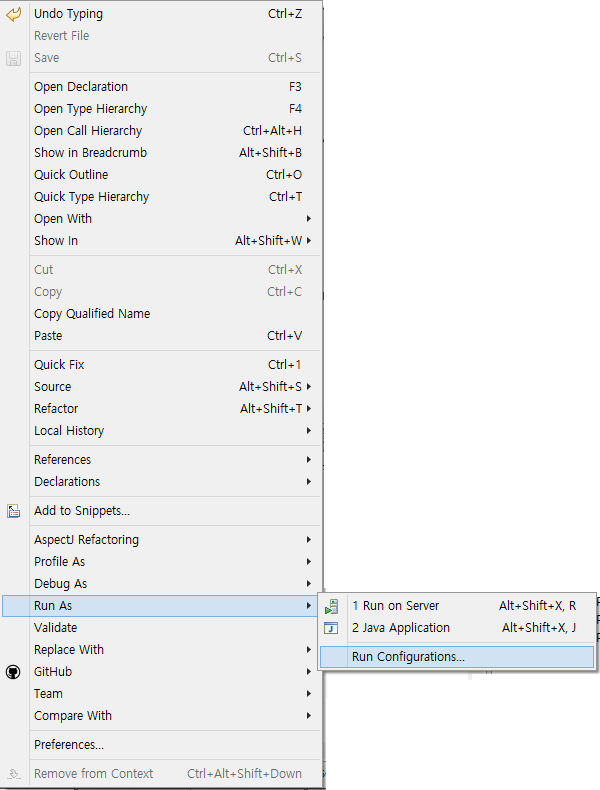 자바에서 마우스 우클릭 후 Run As -> Run Configurations 로 들어가기