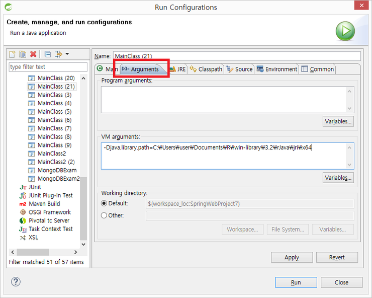 Arguments 탭에서 VM arguments 에 -Djava.library.path=C:\Users\user\Documents\R\win-library\3.2\rJava\jri\x64 라고 쓰기