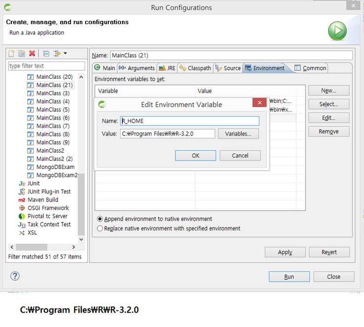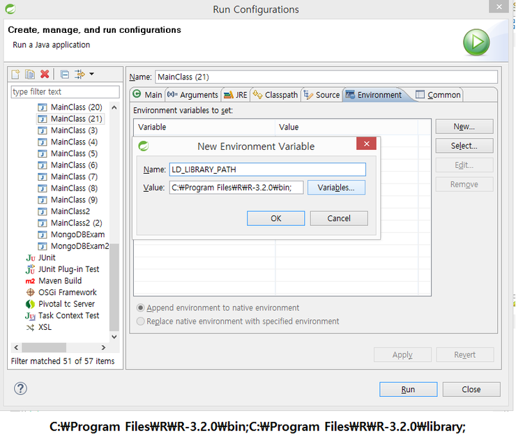 Environment에 LD_LIBRARY_PATH 변수를 만들어서C:\Program Files\R\R-3.2.0\bin;C:\Program Files\R\R-3.2.0\library; 라고 값 넣기.