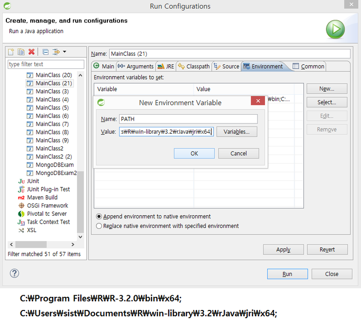 시스템 변수 Path 를 새로 만들어서 C:\Program Files\Java\jre7\bin\server;C:\Program Files\R\R-3.2.0\bin\x64;C:\Users\sist\Documents\R\win-library\3.2\rJava\jri\x64; 라고 쓰기