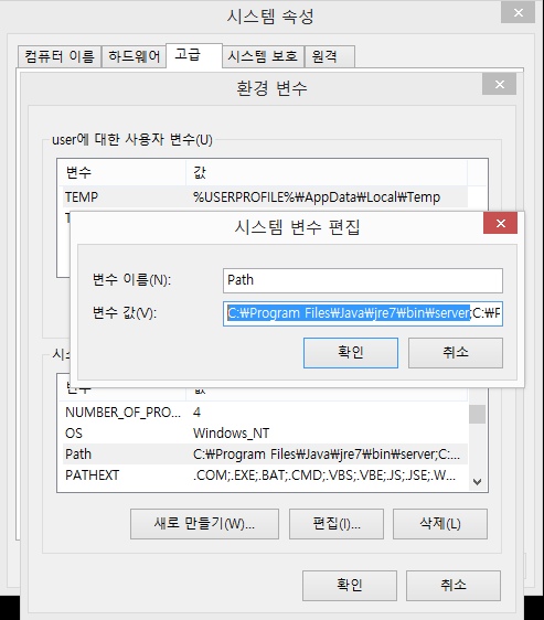 이 경우 Path 변수에 C:\Program Files\Java\jre7\bin\Server; 라고 뒤 쪽이나 앞 쪽에 써주면 된다.