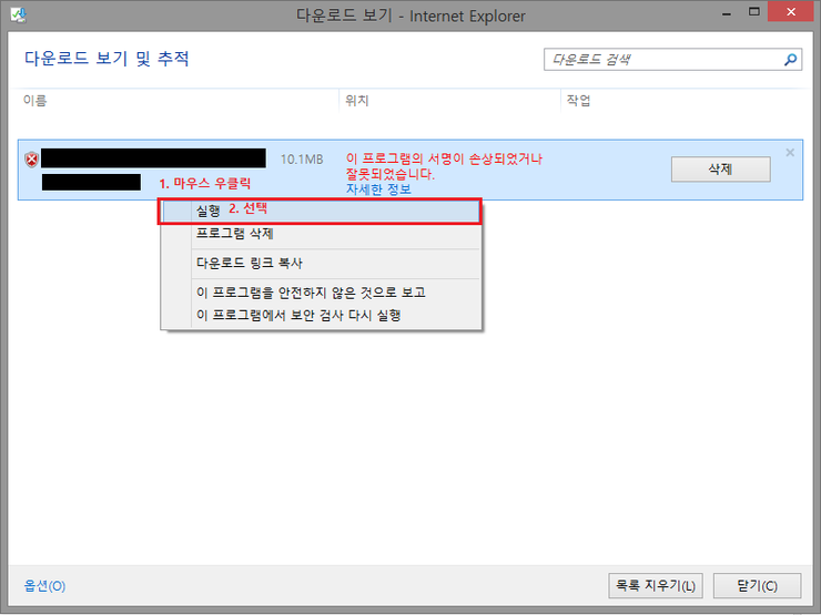 인터넷에서 파일을 다운받았는데, 이 프로그램의 서명이 손상되었거나 잘못되었습니다. 라고 나오는 경우가 있다.