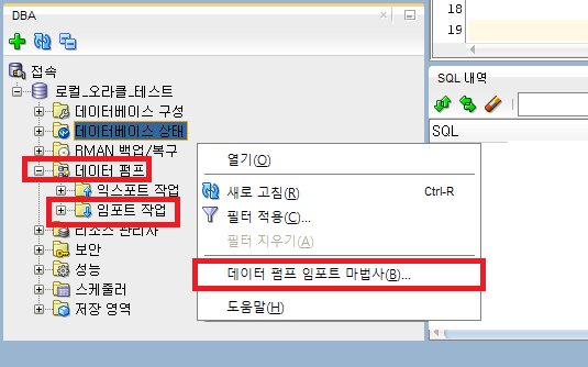 2. 좌측 하단에 생긴 DBA 탭에서 <데이터 펌프> – <임포트 작업> 에서 우클릭하여 <데이터 펌프 임포트 마법사> 를 클릭한다.
