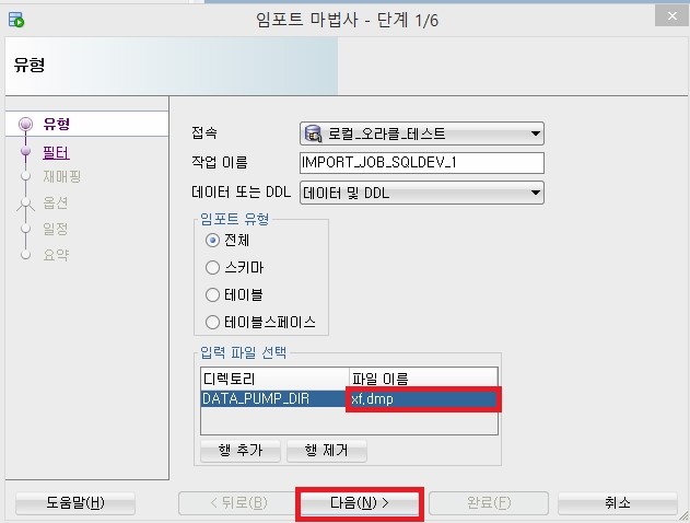 4. 임포트 마법사가 열리면 작업 이름을 적당히 써넣고, 임포트 유형을 선택한다. 여기서 디렉토리가 기본값 DATA_PUMP_DIR 이라고 되어 있는데, 이 안에 Import하고 싶은 덤프 파일(dmp 파일)을 넣으면 된다. 어디인지 감이 잡히지 않을 것이다.