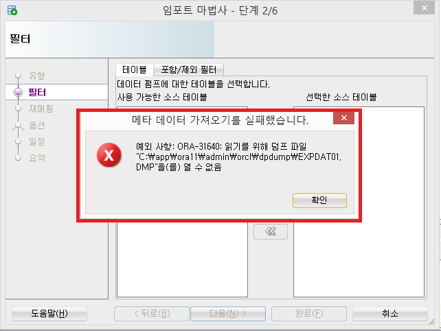 5. 아래와 같이 친절한 에러가 나기 때문에, alert에 뜬 경로 안에 원하는 덤프 파일(dmp파일)을 넣어서 다시 시도하면 된다. 이후 과정은 특별히 어려울 게 없다.