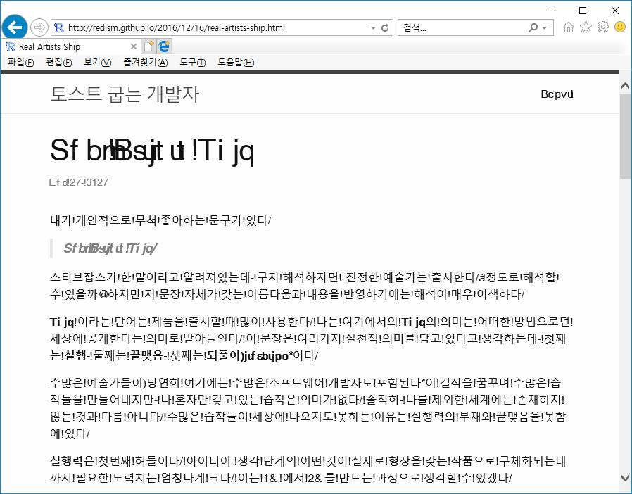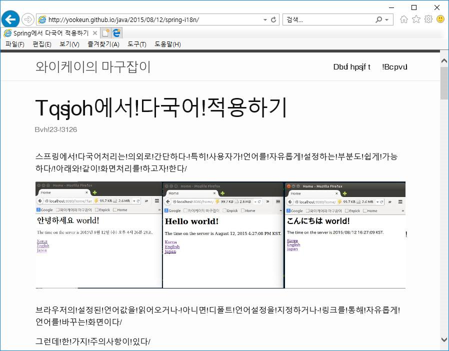 구글에서 이리저리 검색해보았지만 방법을 몰랐다. 막상 내용을 복사 – 메모장에서 붙여넣기 해보면 깨지지 않고 잘 나오는 것으로 보아 IE 브라우저 문제로 보였다. (크롬에서는 정상적으로 보인다)