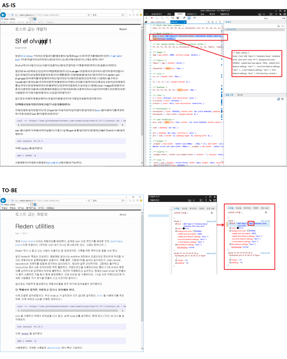 이에 따라 개발자도구에서 body 영역의 font를 Helvetica Neue 에서 굴림 으로 변경하였더니 (임시로나마) 해결됐다.