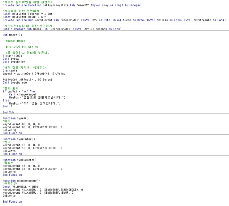 VBA 시작시 키입력의 상태가 항상 영문(또는 한글)이도록 세팅하고 싶을 때가 있다.