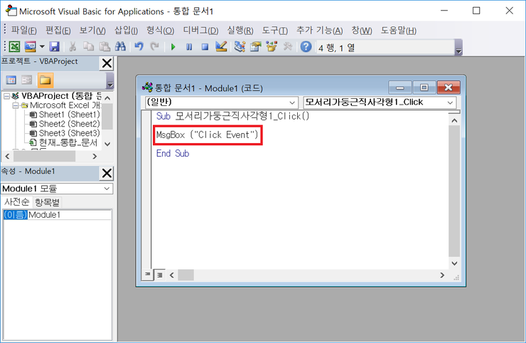 3. VBA 윈도우(Microsoft Visual Basic For Applications의 약자)가 뜰 것이다. “모서리가둥근직사각형1_Click” 이라는 함수가 만들어져있을 것이다. 참고로 “Sub 함수명” 이 함수의 시작이고, “End Sub”가 함수의 끝이다. 여기서 함수명은 중요하지 않으므로, “모서리가둥근직사각형1_Click”이 아니어도 관계없다. 함수 내용부에 MsgBox(“Click Event”) 라고 입력해넣는다.