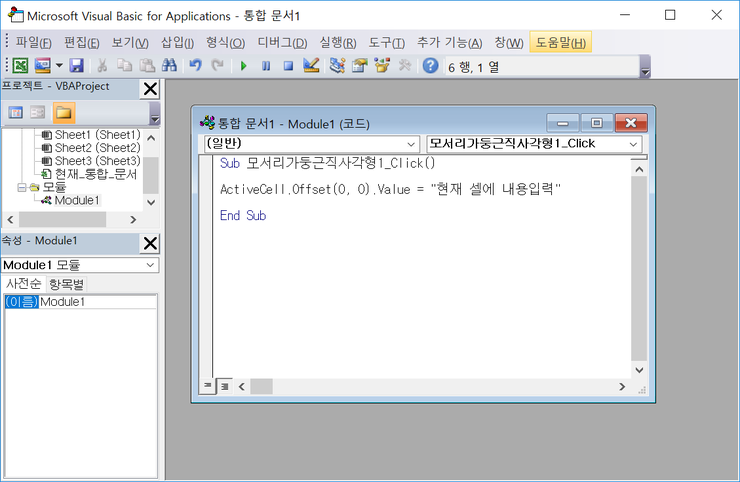 5. 함수 내용을 조금만 더 발전시켜보자. Alt+F11 키를 누르면 VBA 윈도우가 뜬다. 좌측의 Module1을 더블클릭하여 아까 만든 함수를 열어보자. 함수 내용을 ActiveCell.Offset(0, 0).Value = “현재 셀에 내용입력” 으로 수정해보자.