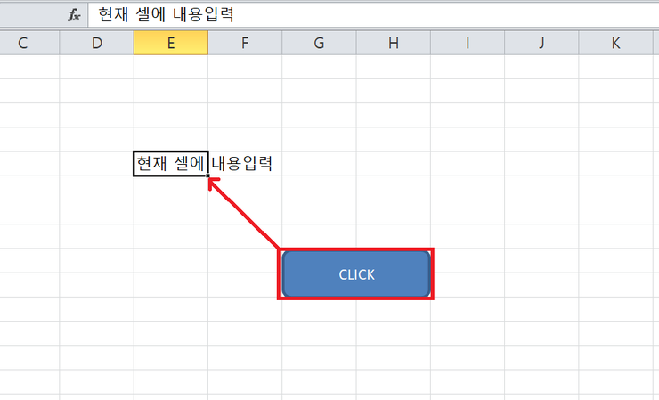 6. 아무 셀이나 빈 셀을 선택해둔 상태에서, Click 버튼을 눌러보자. 선택한 셀의 내용이 “현재 셀에 내용입력”으로 바뀔 것이다.