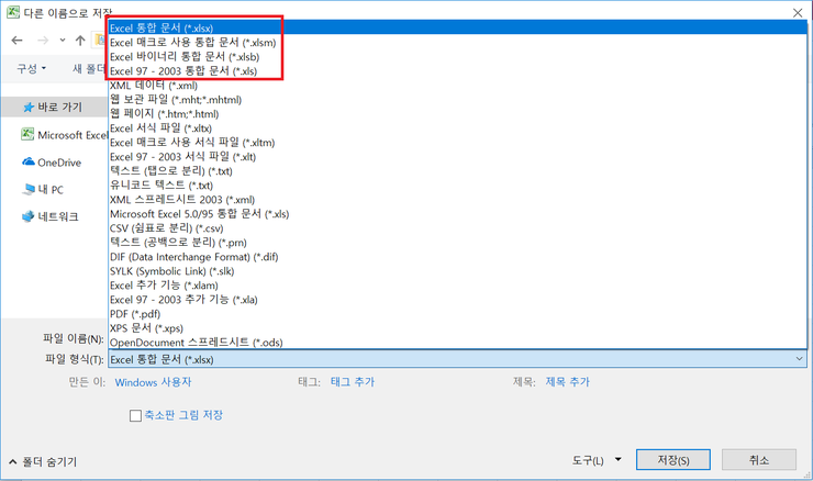 살펴보면 확장자에는 xls와 xlsx만 있는게 아니라, xlsm이라는게 있다. “Excel 매크로 사용 통합 문서(*.xlsm)”이라고 한다. 이 파일 형식으로 선택하면 엑셀과 매크로를 파일 하나로 저장할 수 있다. 결론부터 밝히자면 xlsm 확장자 1번, xlsx 확장자로 1번, 총 2번 저장하기를 권한다.
