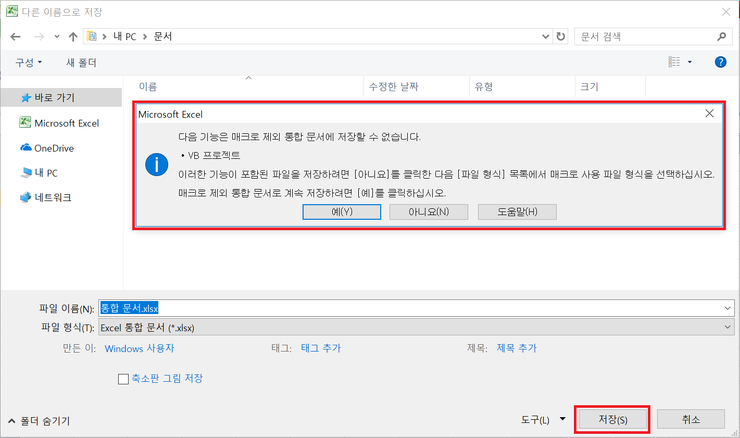 매크로 제외 통합 문서로 계속 저장하려면 [예]를 클릭하십시오.”