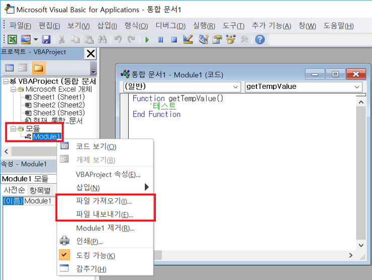 <VBA 모듈을 저장하는 법. 내보내기 하면 세이브하고, 가져오기로 로드할 수 있다>