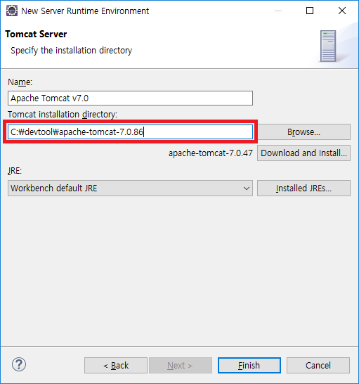 상단 메뉴의 [Window] – [Preferences] – 좌측 리스트의 [Server] – [Runtime Environments] – [Add] 버튼 클릭 – [Apache Tomcat v7.0] 선택 – [Next] – Tomcat installation directory 항목에 톰캣 경로 입력(ex: C:\devtool\apache-tomcat-7.0.86) – [Finish] – [Apply and Close] 버튼 클릭