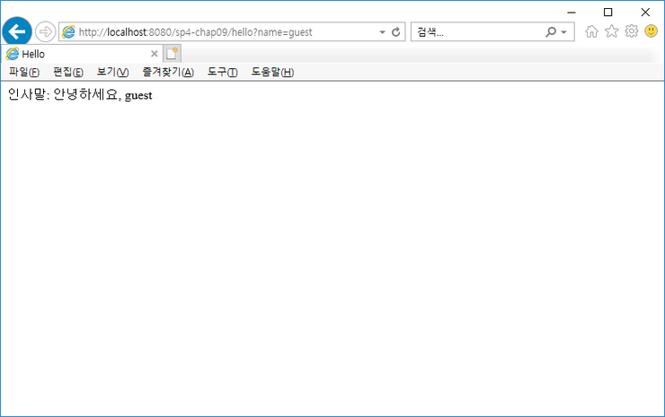 이제 http://localhost:8080/sp4-chap09/hello?name=guest 로 접속한다.