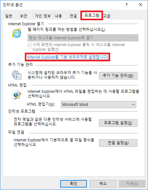 익스플로러 상단 메뉴의 [도구] – [인터넷 옵션] – [프로그램] 탭 선택 – [Internet Explorer를 기본 프로그램으로 설정합니다.] 클릭시