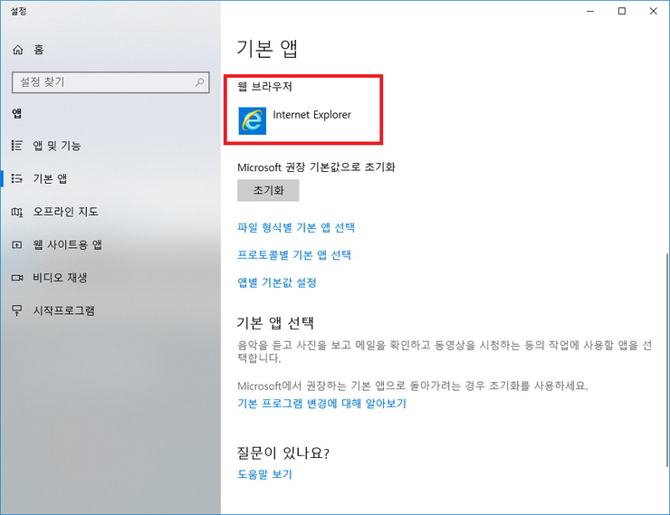 [기본 앱]이라는 창이 떠서 인터넷 브라우저를 선택할 수 있다. 하단 스크린샷 참고.