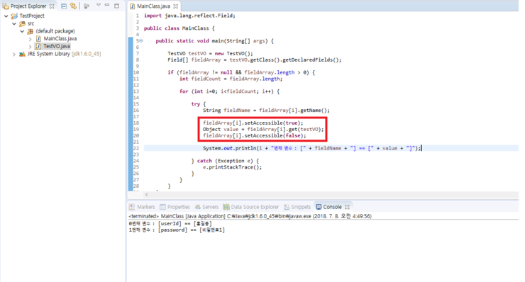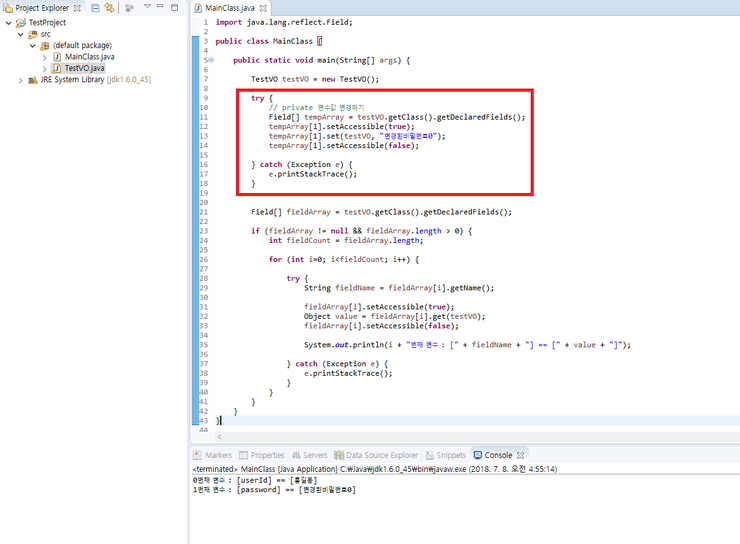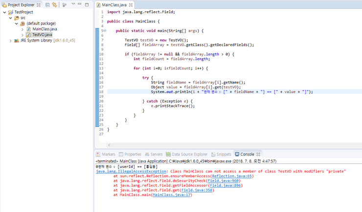 java.lang.IllegalAccessException: Class MainClass can not access a member of class TestVO with modifiers “private”