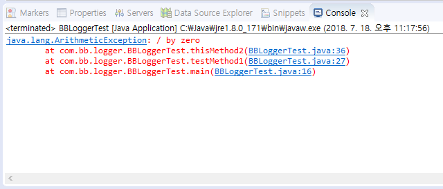 아래 스크린샷은 e.printStackTrace(); 를 쓰지 않고 System.err.println(getStackTraceString(e)); 를 사용했을 때 콘솔이다. 보다시피 printStackTrace() 와 똑같이 표시된다.