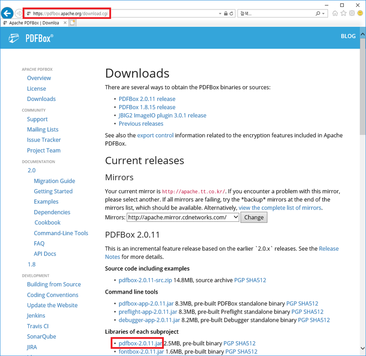우선 http://pdfbox.apache.org/ 에 들어가서 pdfbox-app-2.0.11.jar 를 다운받는다. (아래 그림)
