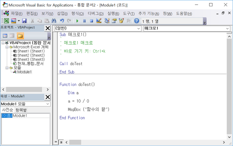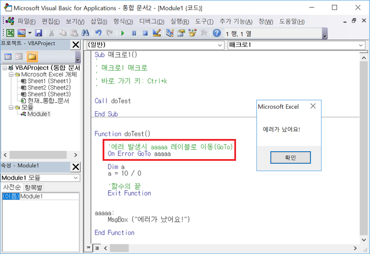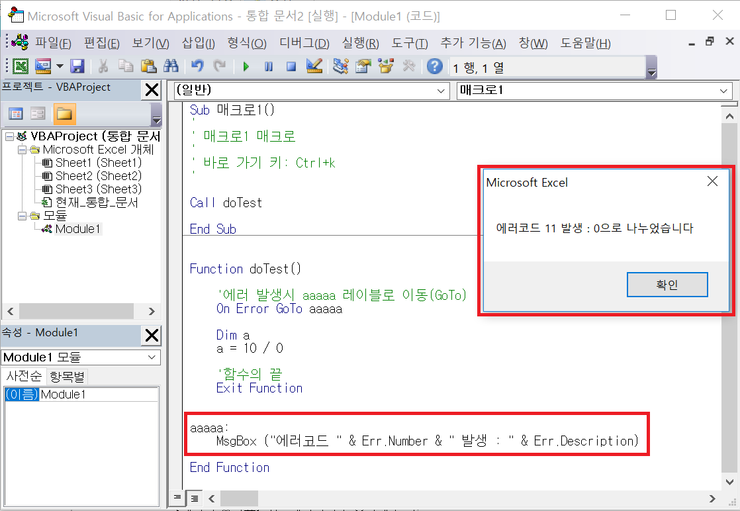 여기서 중요한 것은 레이블 aaaaa 위쪽에 [Exit Function] 이란 명령어를 적어서 함수를 종료시켜주는 것이다.