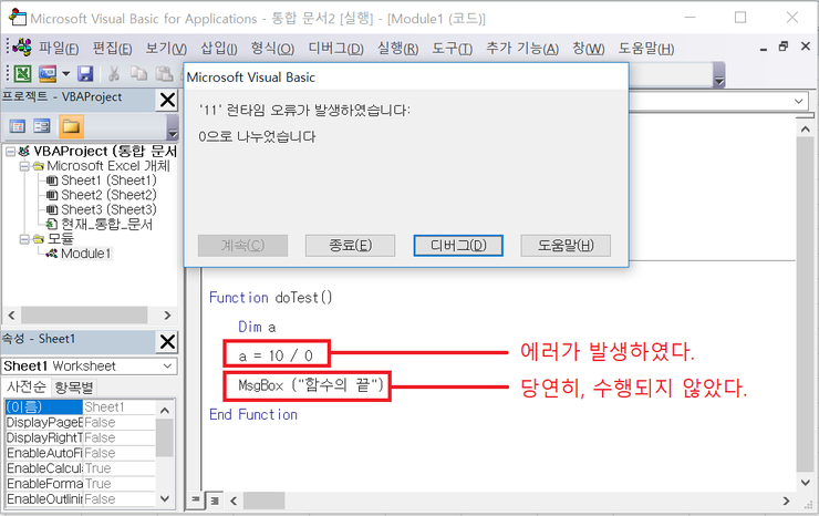 “0으로 나누었습니다”라는 에러가 발생하였다. 당연하게도 그 아래 MsgBox 명령어는 아예 수행되지 않았다.
