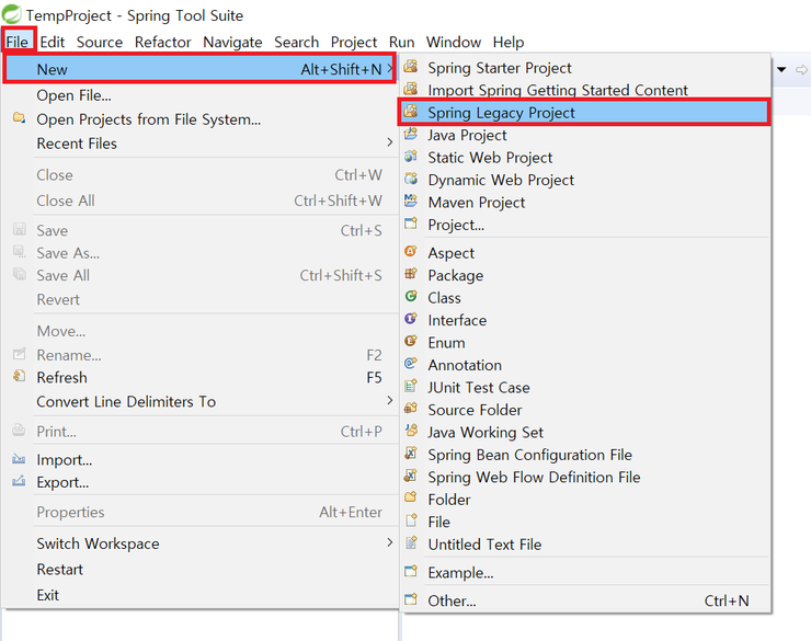 STS 상단 메뉴의 [File] – [New] – [Spring Legacy Project] 를 선택해서 새 프로젝트를 생성한다.