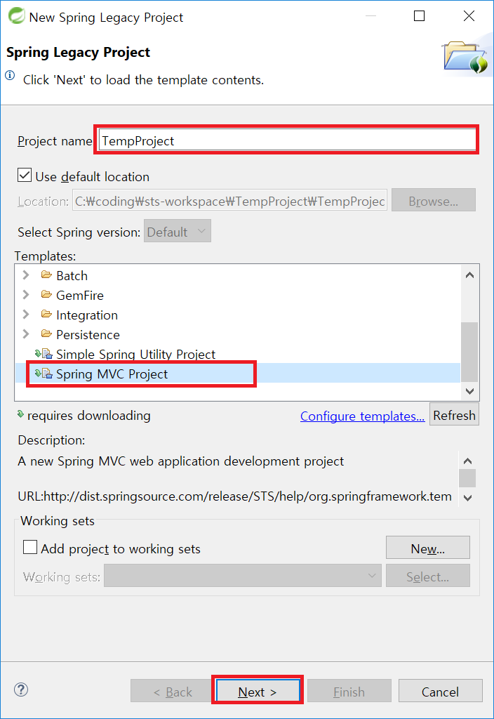 [New Spring Legacy Project] 윈도우가 뜰 것이다. 프로젝트 이름은 TempProject 로 하고, Templates 항목은 Spring MVC Project 를 선택, [Next] 버튼을 클릭한다.