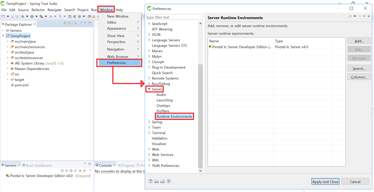 Preferences 윈도우 좌측 메뉴의 [Server] – [Runtime Environments] 항목을 선택한다.