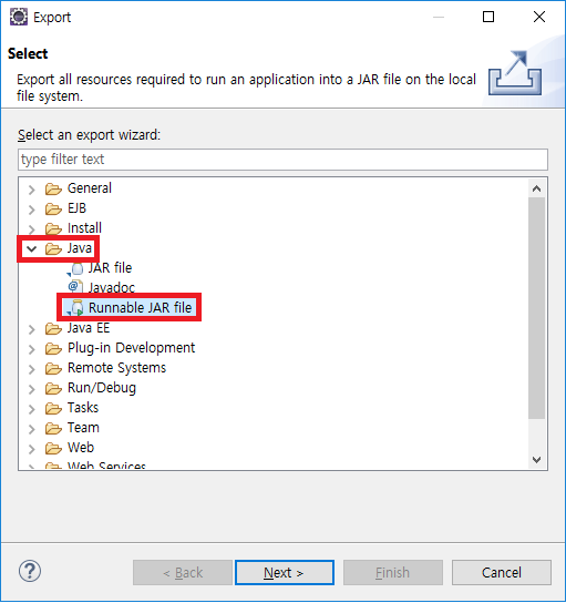 2. Export 창이 뜨면 [Java] – [Runnable JAR File] 을 선택하고 [Next] 를 클릭한다.