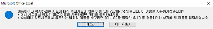 이동하거나 복사하려는 시트에 대상 워크시트에 있는 이름 ‘OOOO’이(가) 있습니다. 이 이름을 사용하시겠습니까? |