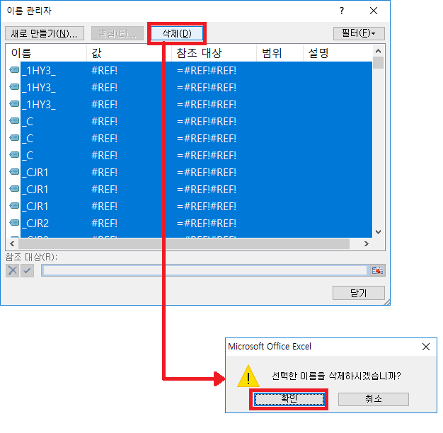 [선택한 이름을 삭제하시겠습니까?] 라는 메시지가 뜨면 [확인] 을 클릭한다.