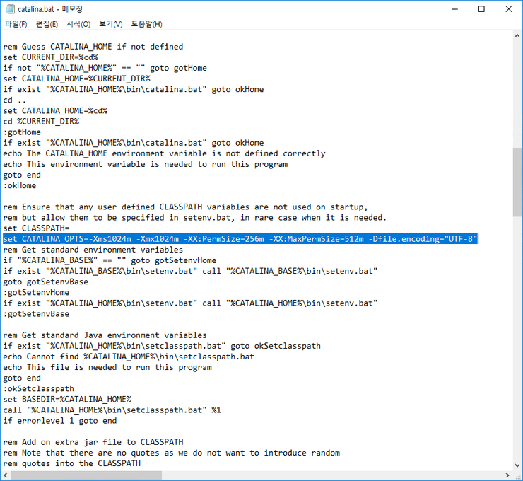 이번은 윈도우 서버여서 catalina.bat 을 수정하였는데, 리눅스라면 톰캣폴더/bin/catalina.sh 파일을 수정하면 된다.