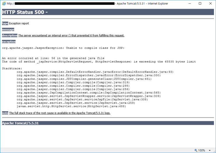 원인은 jsp 파일 내용이 길어지면서 메서드 길이 제한인 65535 를 초과했기 때문이라고 한다.