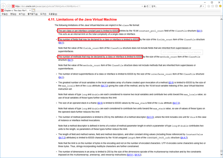4. 11. Limitations of the Java Virtual Machine (중략) The per-class or per-interface constant pool is limited to 65535 entries by the 16-bit constant_pool_count field of the ClassFile structure (§4.1). (중략) The number of fields that may be declared by a class or interface is limited to 65535 by the size of the fields_count item of the ClassFile structure (§4.1). (중략) The number of methods that may be declared by a class or interface is limited to 65535 by the size of the methods_count item of the ClassFile structure (§4.1). (중략) |