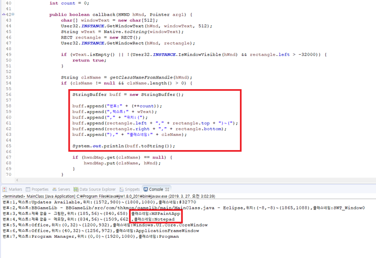 참고로, 프로그램 실행시 getHWNDMap 메서드에서, 핸들 윈도우(HWND) 정보를 콘솔에 출력하는 코드가 있다.