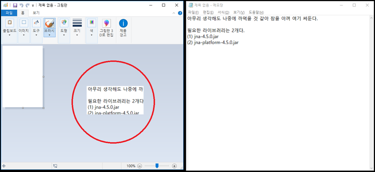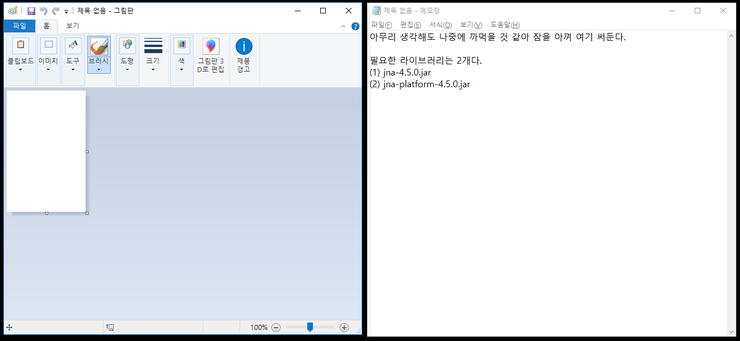 try { HashMap<String, HWND> map = getHWNDMap(); // 그림판 핸들 윈도우(HWND) 가져오기 (미리 그림판을 열어둬야 함) HWND paintHWND = map.get(“MSPaintApp”); if (paintHWND == null) { throw new Exception(“그림판을 켠 후 다시 시도해주세요.”); } // 메모장 핸들 윈도우(HWND) 가져오기 (미리 메모장을 열어둬야 함) HWND notepadHWND = map.get(“Notepad”); if (notepadHWND == null) { throw new Exception(“메모장을 켠 후 다시 시도해주세요.”); } HDC paintHDC = User32.INSTANCE.GetDC(paintHWND); HDC notepadHDC = User32.INSTANCE.GetDC(notepadHWND); // 그림판 300, 300 위치에 메모장의 0~200, 0~100 영역을 고속복사 GDI32.INSTANCE.BitBlt(paintHDC, 300, 300, 200, 100, notepadHDC, 0, 0, WinGDIConf.SRCCOPY); } catch (Exception e) { e.printStackTrace(); } } /** * 윈도우 클래스 네임 문자열(String)을 put 하면 윈도우 핸들 윈도우(HWND)를 리턴하는 HashMap. * HashMap에는 첫번째 발견된 핸들 윈도우(HWND)만 저장하며, 클래스 네임이 중복될 경우 무시한다. * @return */ public static HashMap<String, HWND> getHWNDMap() {