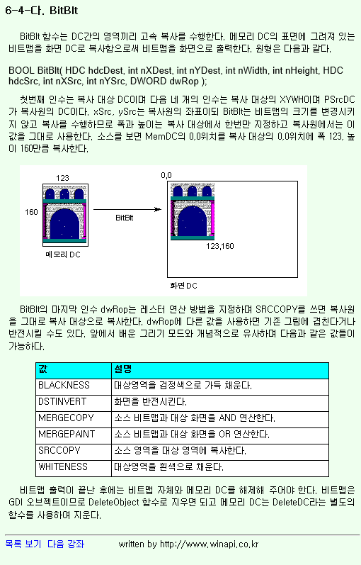 참고로 BitBlt 로 그려진 이미지는 해당 핸들 윈도우(HWND)를 움직이거나 최소화할 경우 곧바로 사라진다. 그만큼 가볍고 빠르게 화면을 복사하기에 유용한 함수이다.