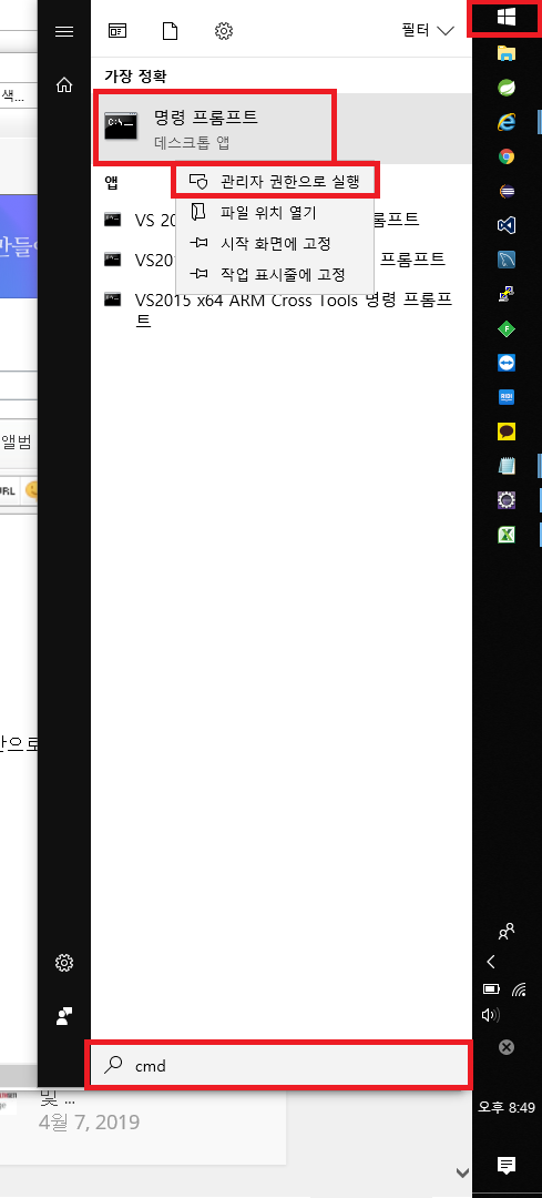 1. 윈도우 메뉴 – cmd 검색 (명령 프롬프트) – cmd 위에서 마우스 우클릭 – [관리자 권한으로 실행]