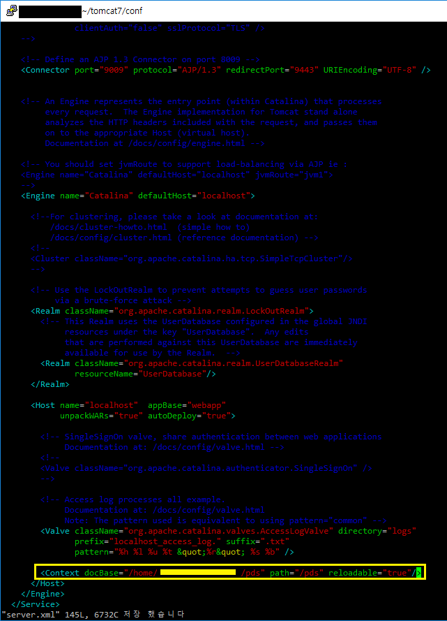 예) <Context docBase=”/home/test1/test2/pds” path=”/pds” reloadable=”true”/></Host>