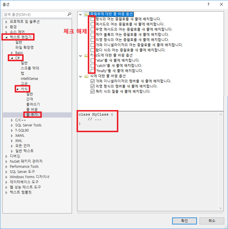 3. “형식의 여는 중괄호를 새 줄에 배치합니다.”, “메서드의 여는 중괄호를 새 줄에 배치합니다.” 등 체크해제