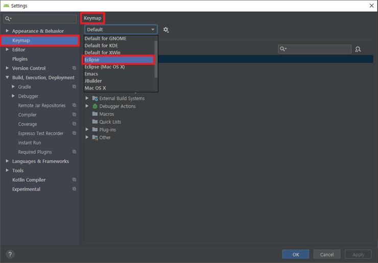 작성일자 2019년 6월 24일 글쓴이 thkmon[Android] 안드로이드 스튜디오 이클립스 기준으로 키 변경 [Android] 안드로이드 스튜디오 이클립스 기준으로 키 변경 안드로이드 스튜디오의 키를 이클립스 기준으로 바꾼다.