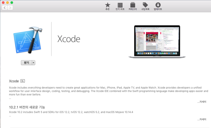1-3. Xcode [받기] – [앱 설치] 버튼을 차례로 눌러 설치한다.