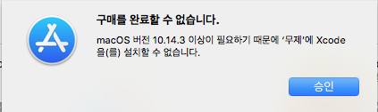 [구매를 완료할 수 없습니다. macOS 버전 10.14.3 이상이 필요하기 때문에 ‘무제’에 Xcode을(를) 설치할 수 없습니다.] 라는 메시지가 떴다.