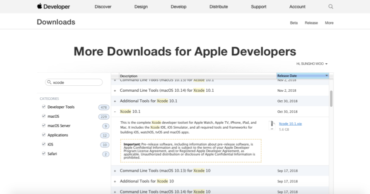 위 주소로 접속하여, 좌측 인풋박스에 [Xcode]를 입력하고 검색, 우측 목록을 살펴보았더니 Xcode 10.1 버전이 있었다.