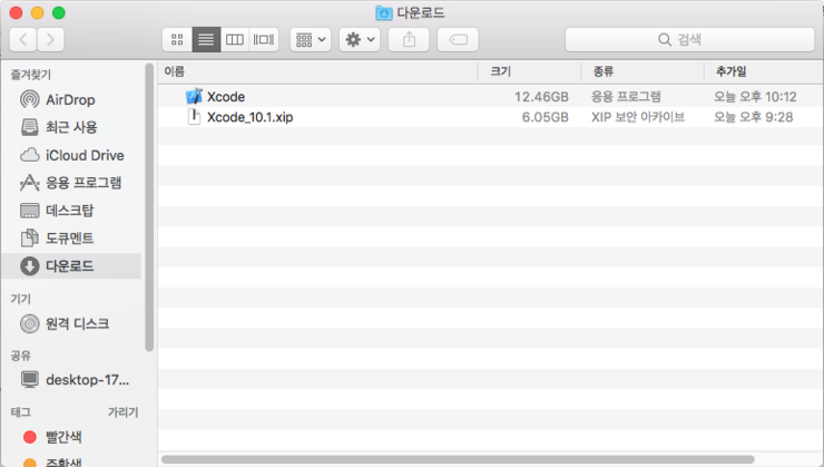 Xcode_10.1.xip 파일이 [다운로드] 폴더에 들어왔다.